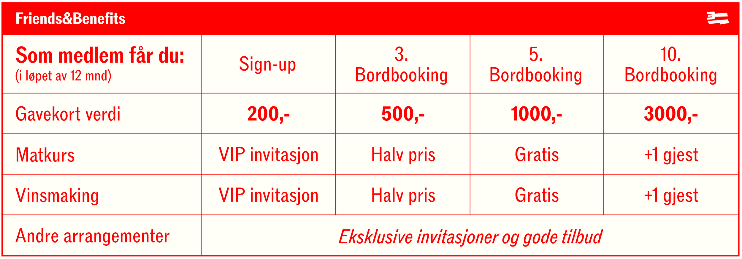 Du kan tjene poeng hver gang du booker et bord i ditt navn / med ditt telefonnummer. Med kvalifiserende poeng kan du klatre til neste nivå. Hvert nivå utløser gavekort, som kan brukes fritt i våre restauranter, samt rabatter på utvalgte arrangementer.